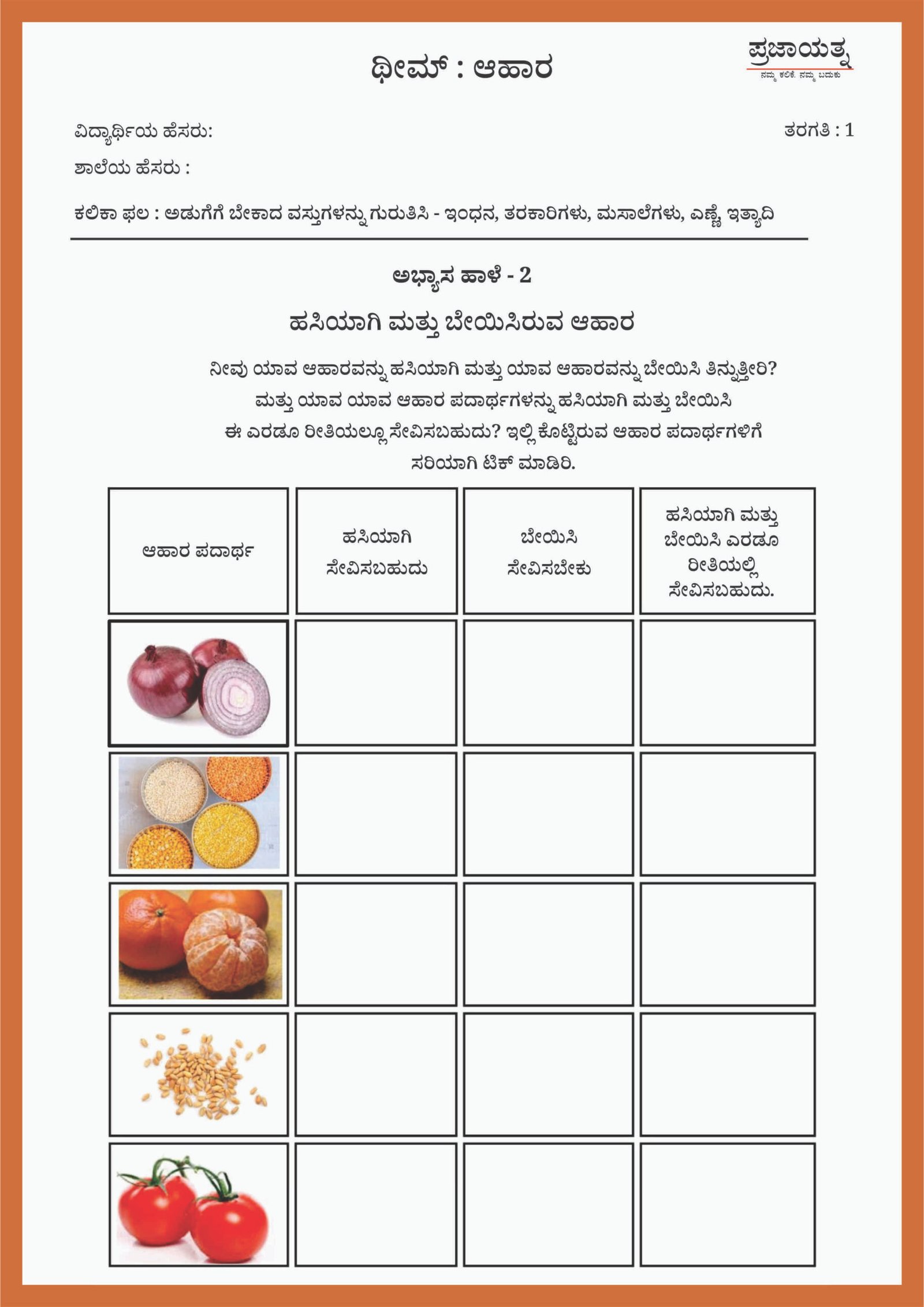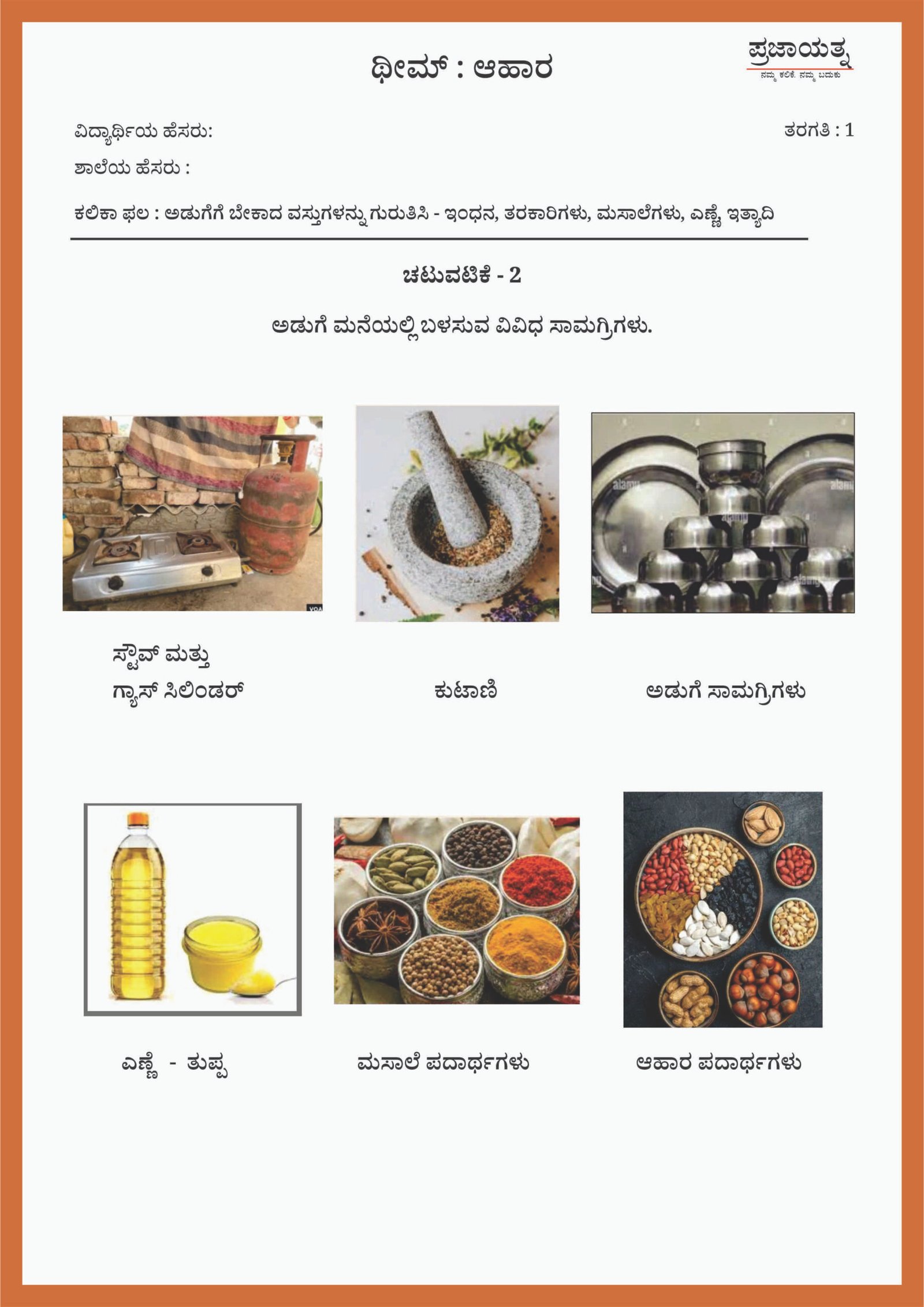 G1-EVS-LO-6 : ಅಡುಗೆಗೆ ಬೇಕಾದ ವಸ್ತುಗಳನ್ನು ಗುರುತಿಸಿ – ಇಂಧನ, ತರಕಾರಿಗಳು, ಮಸಾಲೆಗಳು, ಎಣ್ಣೆ, ಇತ್ಯಾದಿ.