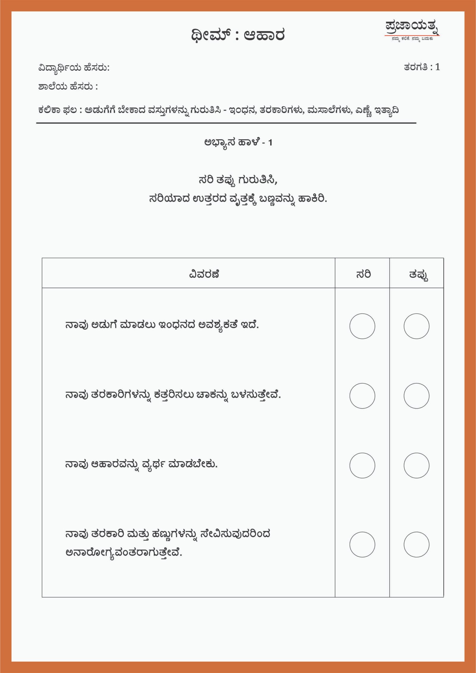 Practise sheet- 1 ಅಭ್ಯಾಸ ಹಾಳೆ – 1